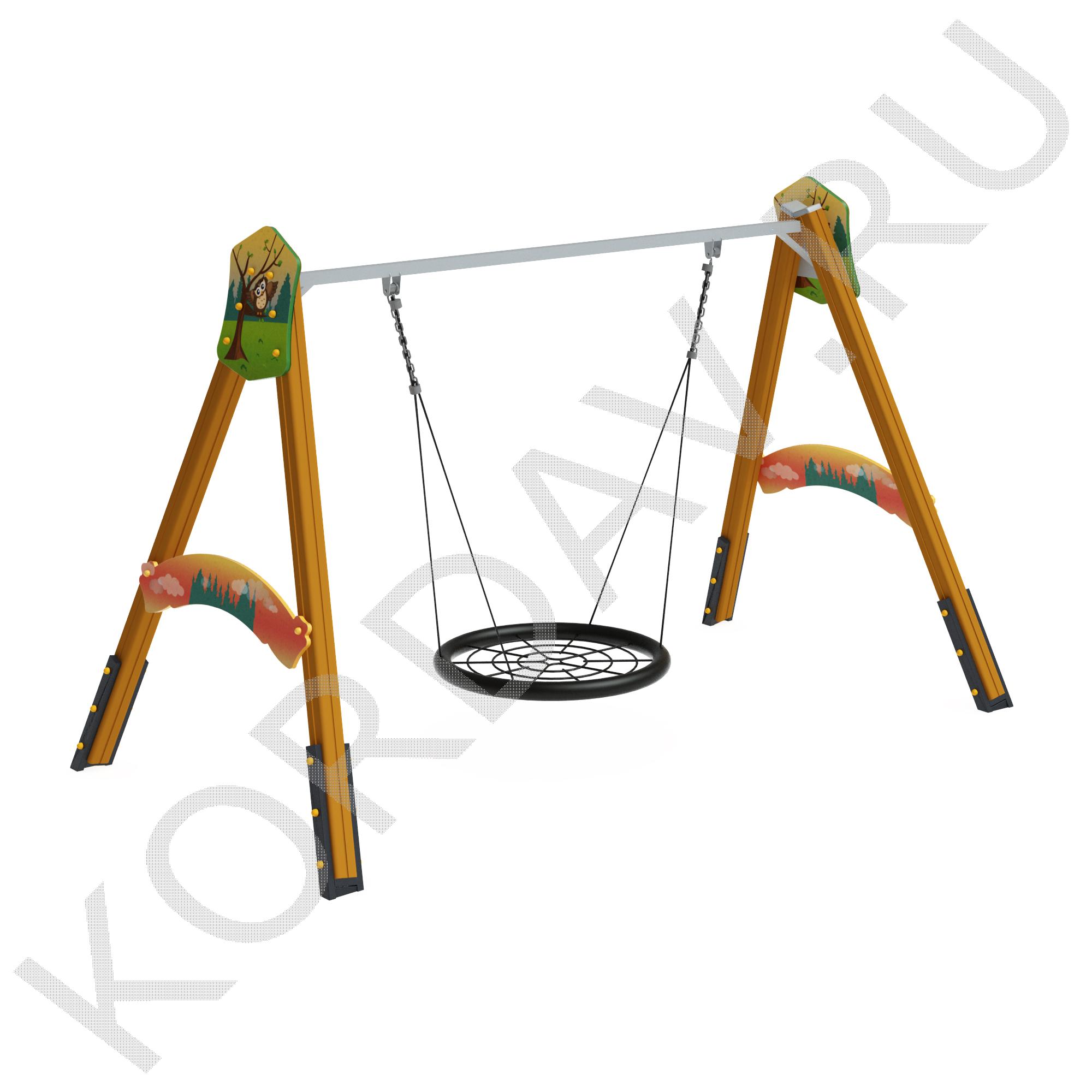 Сиденье «Гнездо»Диаметр сиденья — 1000 мм. Плетение внутри кольца выполнено из четырёхпрядного армированного каната диаметром 16 мм. Качели комплектуются подвесами из шестипрядного армированного каната. Длина подвесов — 1340 мм. Подвес из цепи. Цепь: короткозвеньевая, не калиброванного класса, прочность металла Т(8), диаметр сечения звена цепи 6 мм. Цепи соединены в единый подвес наконечником для крепления к перекладине качели. Наконечник выполнен из втулки с подшипниками и скобы.